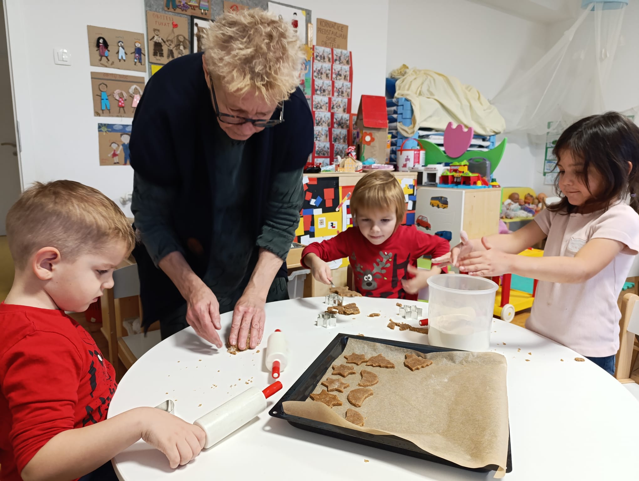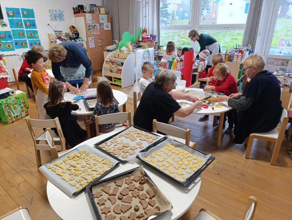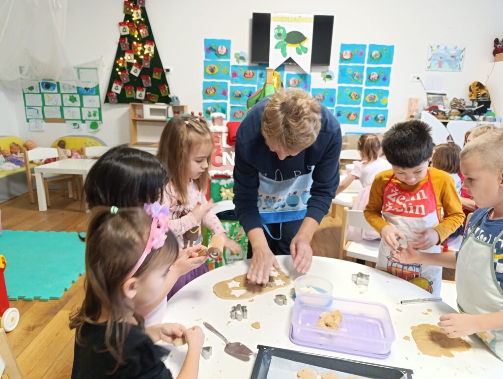 Nakon priče, uslijedila je druga adventska aktivnost, zbog koje su bake stigle u vrtić. Vrijedne ruke baka, došle su pripomoći djeci, pripremiti božićne kolače. Tako su bake Marina, Ankica, Vesna, Marijana i Luana, podijelile svoja znanja, vještine i iskustva pripreme božićnih kolača. Zajedno s djecom mijesile su, valjale i izrezivale kalupima božićne kolače. Prenijele su svojim unucima Lovri, Petru, Roku, Pauli, Piji i njihovim prijateljima iz skupine recepte za paprenjake, medenjake, krancle. Bake su strpljivo usmjeravale djecu kako bi djeca što više kolača sama izradila i na kraju su napunili punih 9 plehova koje su potom odnijeli u pekarnu Edi, u blizini vrtića, da se ispeku. Svojim dobrim susjedima iz pekare, djeca su darovala božićne suvenire iz svoje Suvenirnice kao i blagdansku čestitku koju su za tu prigodu izradili.