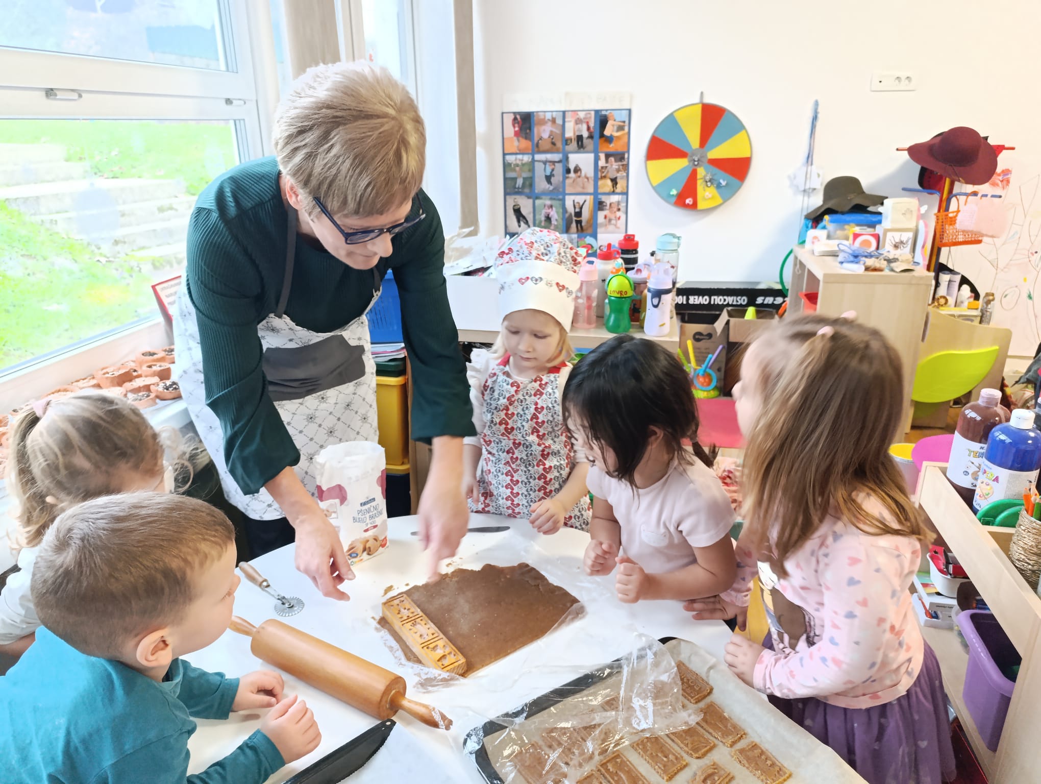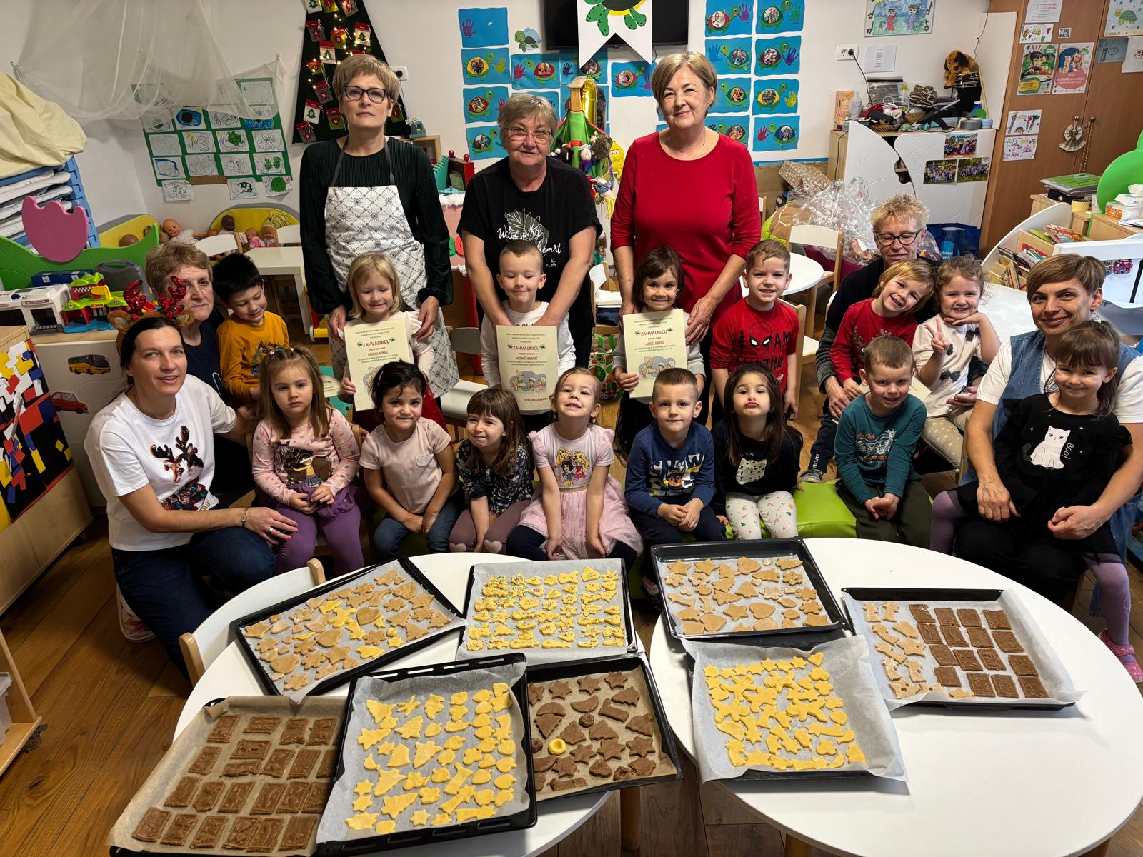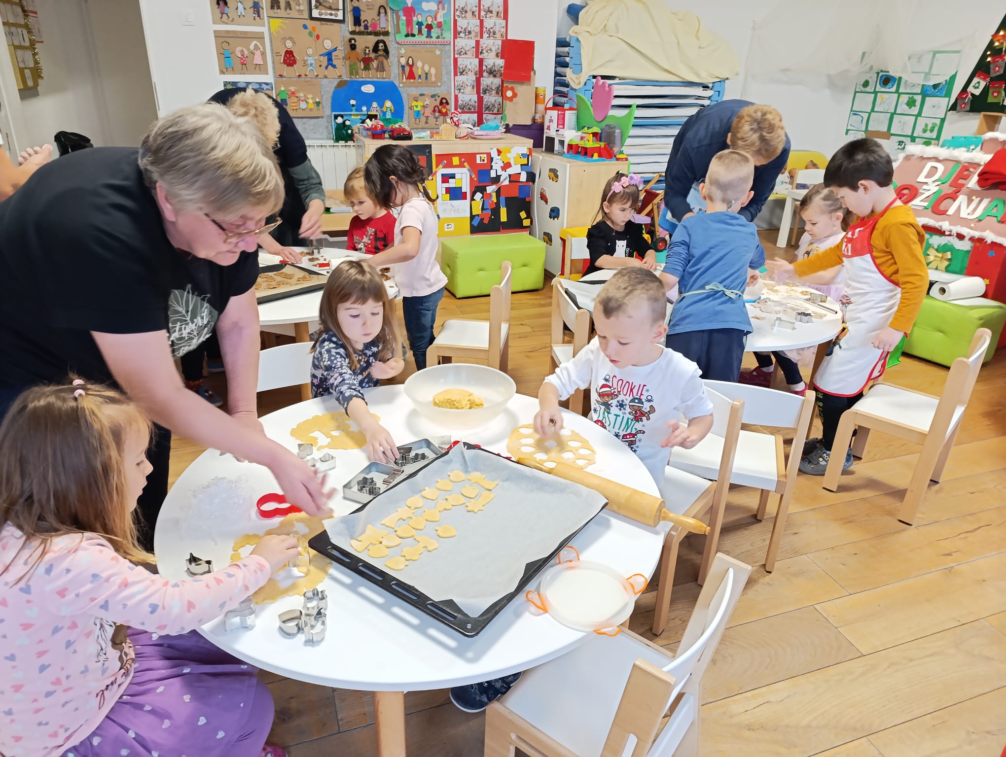 Nakon priče, uslijedila je druga adventska aktivnost, zbog koje su bake stigle u vrtić. Vrijedne ruke baka, došle su pripomoći djeci, pripremiti božićne kolače. Tako su bake Marina, Ankica, Vesna, Marijana i Luana, podijelile svoja znanja, vještine i iskustva pripreme božićnih kolača. Zajedno s djecom mijesile su, valjale i izrezivale kalupima božićne kolače. Prenijele su svojim unucima Lovri, Petru, Roku, Pauli, Piji i njihovim prijateljima iz skupine recepte za paprenjake, medenjake, krancle. Bake su strpljivo usmjeravale djecu kako bi djeca što više kolača sama izradila i na kraju su napunili punih 9 plehova koje su potom odnijeli u pekarnu Edi, u blizini vrtića, da se ispeku. Svojim dobrim susjedima iz pekare, djeca su darovala božićne suvenire iz svoje Suvenirnice kao i blagdansku čestitku koju su za tu prigodu izradili.