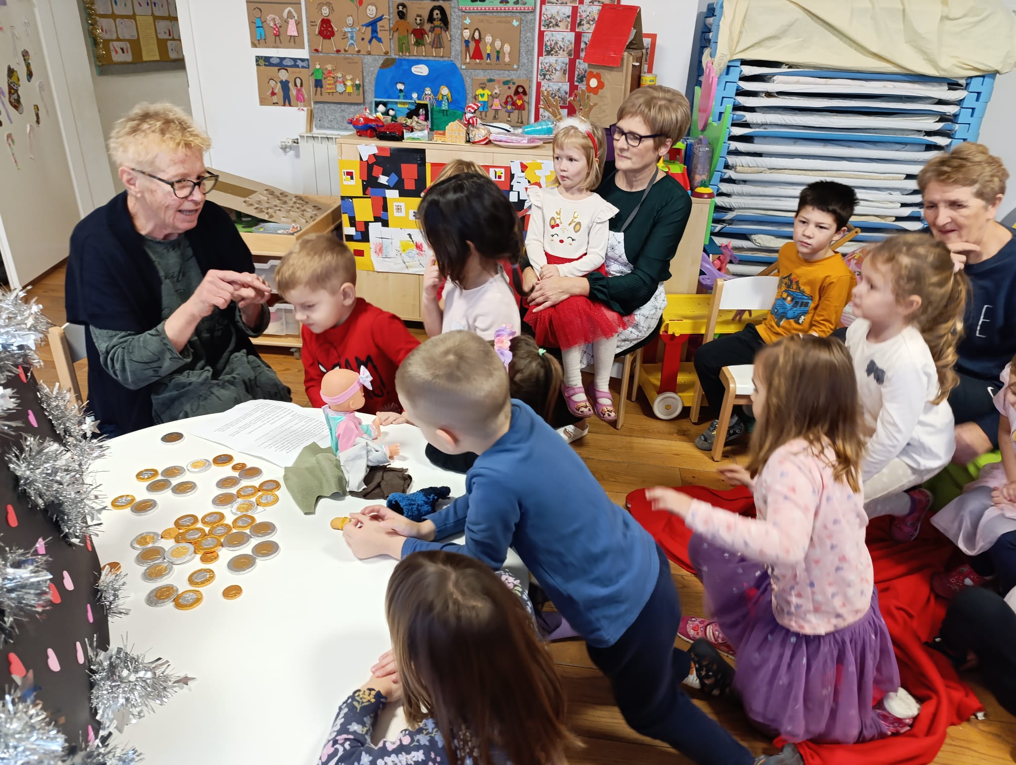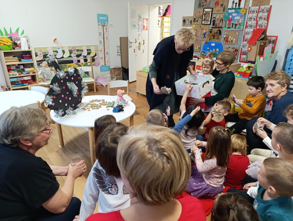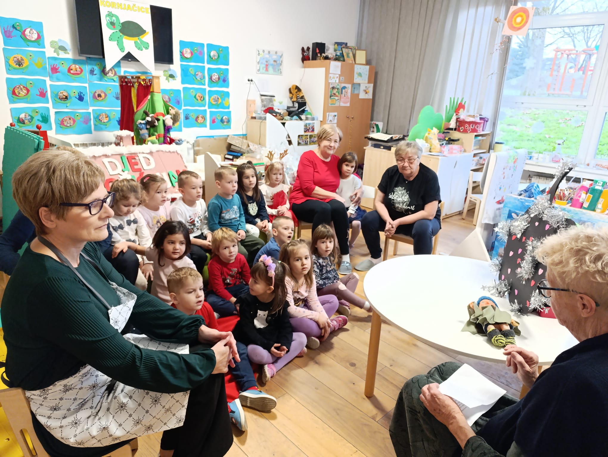 Predbožićno razdoblje, vrijeme je zajedništva, posebnih priča i čarobnih trenutaka. Jedna takva priča dogodila se u objektu Slap našeg vrtića. U utorak 16. prosinca, u sobu dnevnog boravka odgojne skupine Kornjačice, stigle su bake. Njih pet, stiglo je u skupinu koju pohađaju njihovi unuci, kako bi njima i njihovim prijateljima upotpunile čaroliju iščekivanja blagdana. Adventsko druženje, započela je baka Luana s bajkom Zvjezdani taliri. Uz pomoć stolnog kazališta dočarala je bajku Braće Grimm, koja priča o nesebičnosti i dobroti siromašne djevojčice koja je podijelila sve što je imala. Bajka je poučila djecu da je davanje važnije od posjedovanja te da dobro djelo nikad ne ostaje bez nagrade. Za nesebično davanje drugima, na kraju priče djevojčica je bila nagrađena. A na kraju priče, baka Luana darivala je male Kornjačice. Svakom djetetu kreativna baka, poklonila je anđele, koje je sama izradila.