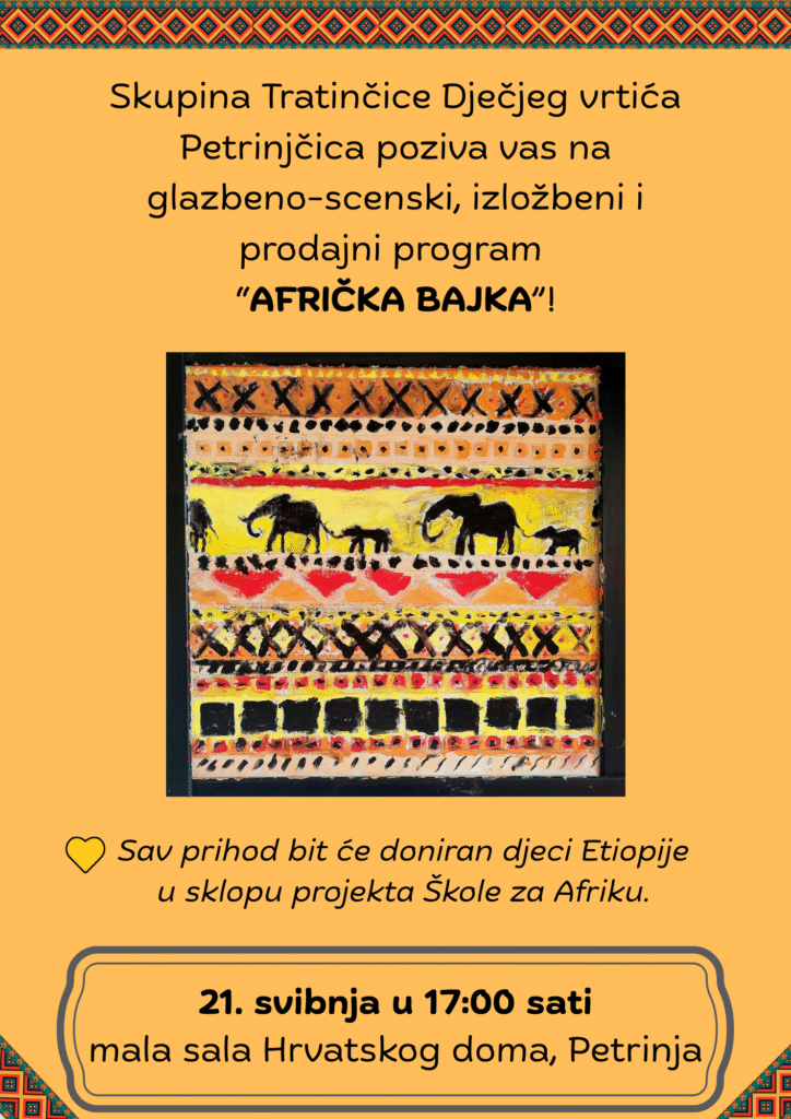 Naša vrijedna skupina Tratinčice s velikim je veseljem sudjelovala u međunarodnom humanitarnom projektu Škole za Afriku. Dječji vrtić Petrinjčica u partnerstvu je s UNICEF-om, što je i potaknulo ovaj projekt. Tijekom proteklih tjedana Tratinčice su upoznavale život djece u Africi – njihove običaje, glazbu, životinje i način života. Kroz likovno stvaralaštvo, glazbu, igru i radionice s roditeljima, stvarali su radove koje ćete moći pogledati i podržati na njihovom izložbeno-prodajnom sajmu. Ali, to nije sve! Naše Tratinčice su za vas pripremile i glazbeno-scensku predstavu „Afrička bajka“, u koju su utkali puno mašte, znanja i dobrote.