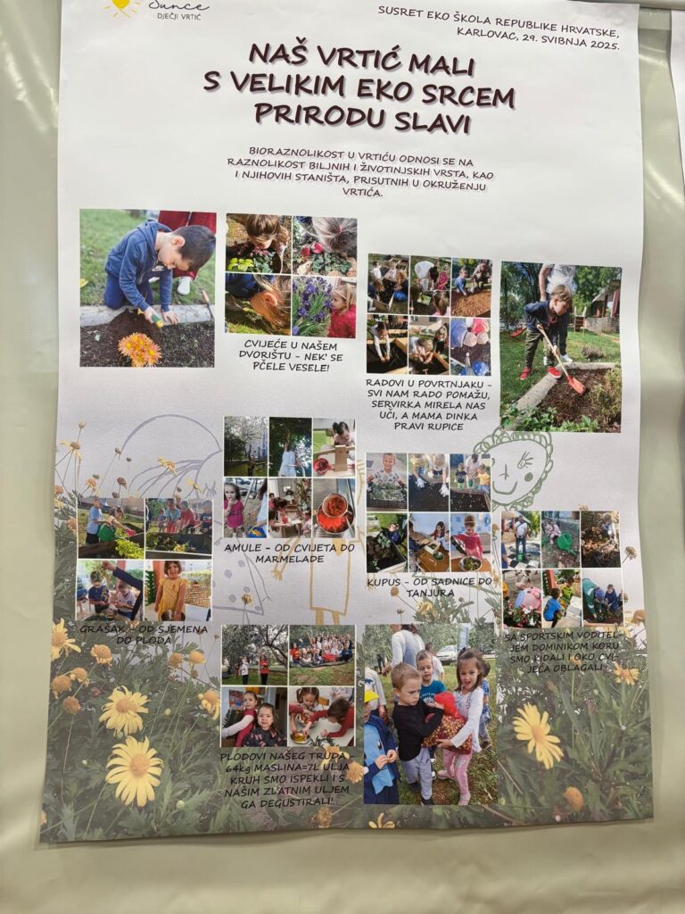 Tom prigodom svi sudionici imali su priliku pratiti dva stručna predavanja, 10 izlaganja primjera dobre prakse ekoškola, sudjelovati na edukativnoj radionici te razgledati posterske primjere dobre prakse vrtića koji imaju status ekoškole u RH. U programu su sudjelovala djeca iz karlovačkih vrtića koja su prikazala tradicijske igre i plesove svoga kraja.