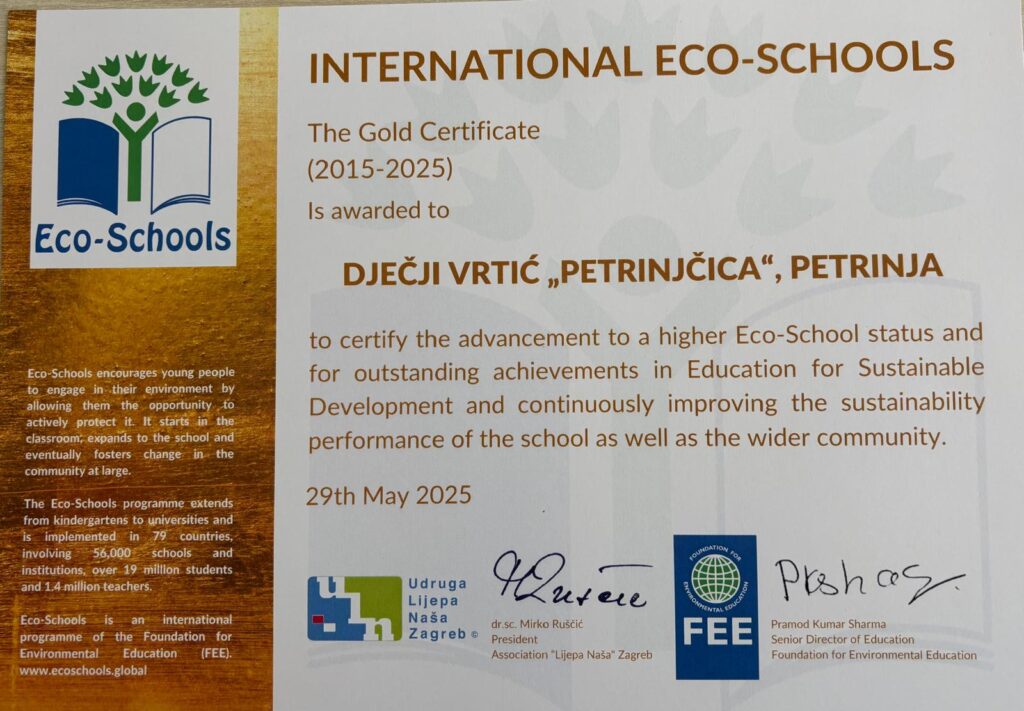 Na Svečanosti promocije 25. generacije Ekoškola i obnove statusa međunarodnih Ekoškola Republike Hrvatske, Dječji vrtić Petrinjčica Petrinja po peti put je obnovio status međunarodne Ekoškole. U ime vrtića svečanosti su nazočili pedagoginja Višnja Vukša, psiholog David Vujasić te koordinatorica Ekoškole Anabela Kunert, kojima je tom prigodom uručen certifikat za zlatni status ekoškole i Zelena Zastava.