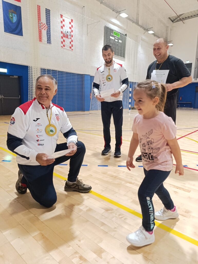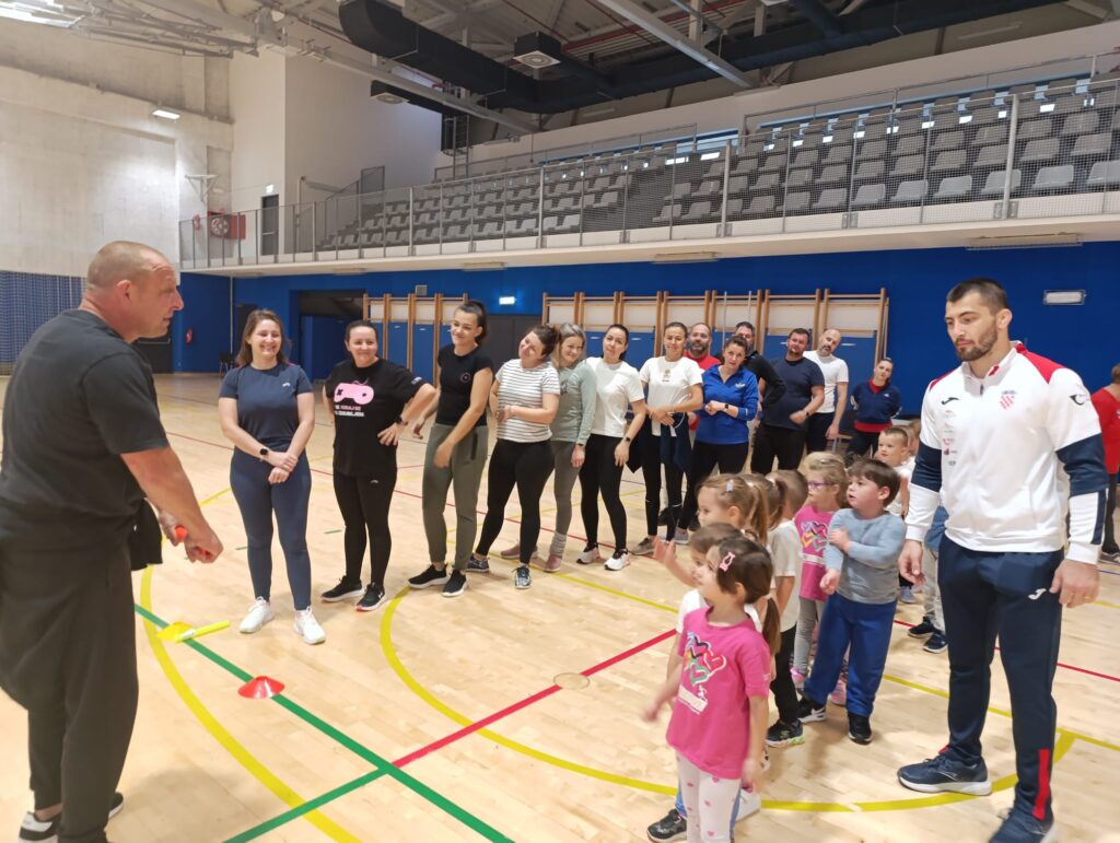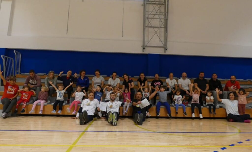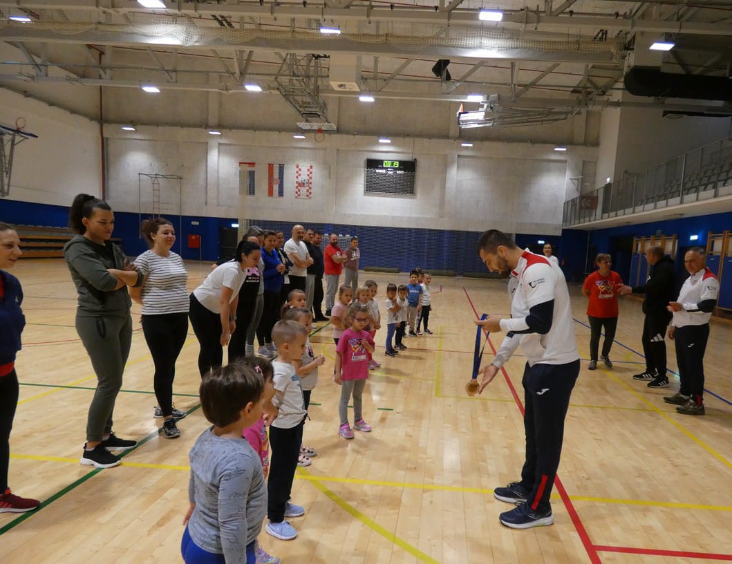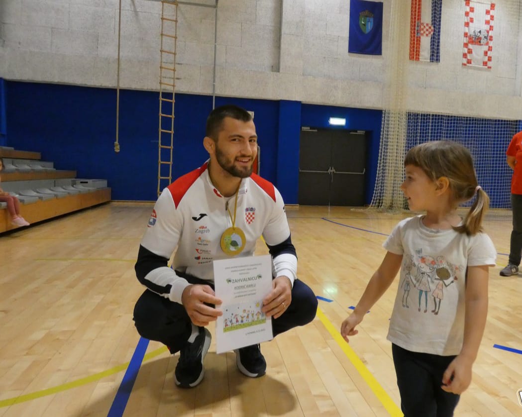 Trener Vinko upoznao je sve prisutne i s Karlom Kodrićem kojem je trener, a koji je nedavno na Svjetskom prvenstvu održanom u Zagrebu osvojio brončanu medalju koju je donio i pokazao svima koji su vježbali u dvorani. Nakon upoznavanja, trojica hrvača, započela su trening s okupljenom djecom i roditeljima. Najprije su se svi dobro razgibali uz vježbe za zagrijavanje, potom su svladavali poligon prepreka koji je sadržavao različite motoričke zadatke. Natjecateljskom štafetnom igrom u kojoj su se djeca natjecala protiv roditelja, trening je završio. Naravno pogađate, djeca su pobijedila, što ne začuđuje, jer Kornjačice svaki petak aktivno vježbaju sa svojim odgojiteljcama Anabelom Kunert i Majom Latin. Kao sjećanje na ovaj nezaboravan dan, koji je bio ispunjen zajedničkim vježbanjem i druženjem, djeca su predala hrvačkom trojcu zahvalnice i medalje zlatnog sjaja koje su za njih izradili.