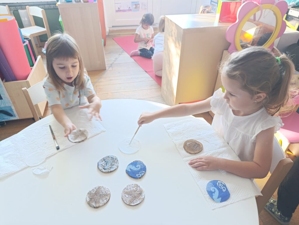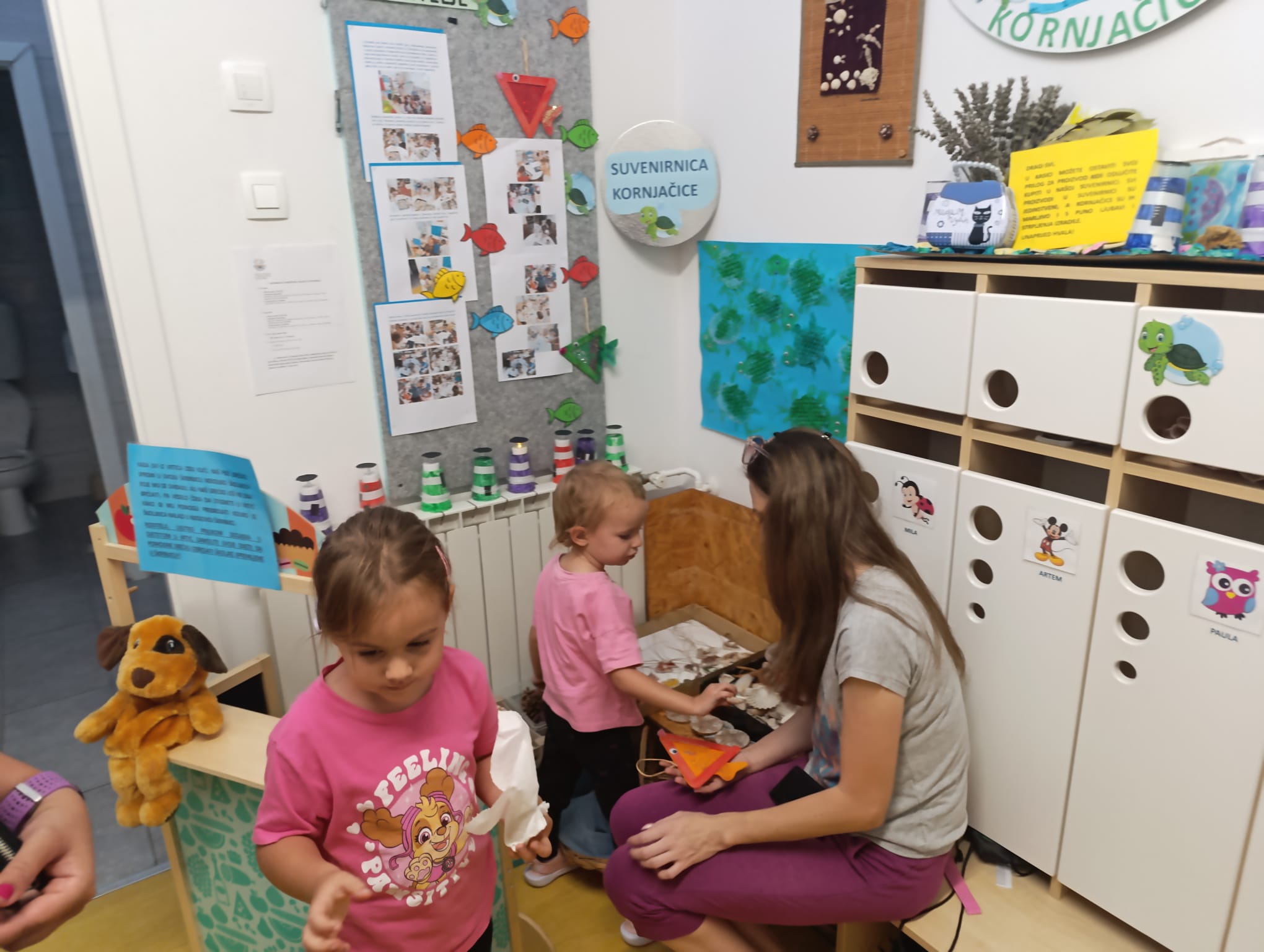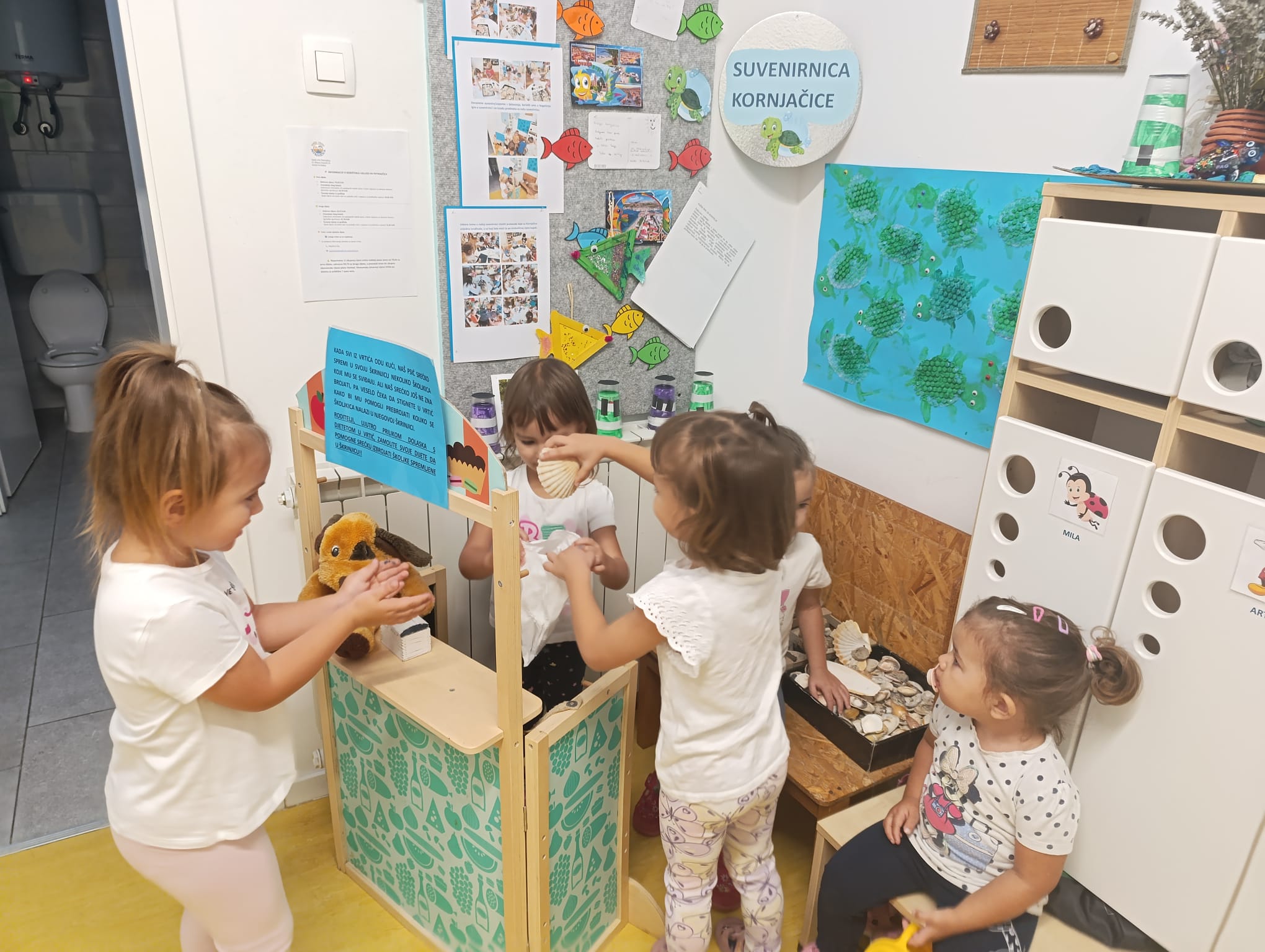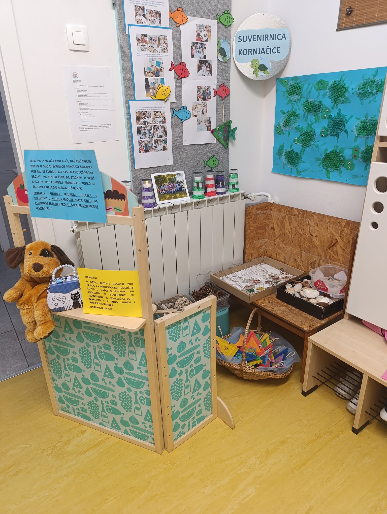 U vrtićima postoje raznovrsni centri ili kutići aktivnosti, od likovnog, dramskog, glazbenog, istraživačkog kutića pa sve do kutića za početno čitanje i pisanje, za građenje ili za uljepšavanje… Ako svratite u objekt Slap, u prostoru garderobe malih Kornjačica, naići ćete na jedan doista neuobičajen kutić. Naime, odgojiteljice su s djecom oformile kutić suvenirnice. Sve je započelo donošenjem uspomena i suvenira s ljetovanja, kamenčića, školjkica, štapića od sladoleda, magneta, i sl. Uz donesene uspomene s ljetovanja i dodatne materijale koji se nalaze vrtićkoj sobi, odgojiteljice su poticale kreativnost malih Kornjačica te su nastali novi unikatni predmeti. Svoje izrađene predmete: ogrlice od glinamola sa stakalcima koje je izbrusilo more i školjkicama, svjetionike, podmetače za čaše, ribice od drvenih štapića od sladoleda, izložile su u svojoj suvenirnici. Svima koji su poželjeli imati unikatne proizvode, omogućile su kupnju po simboličnim cijenama.