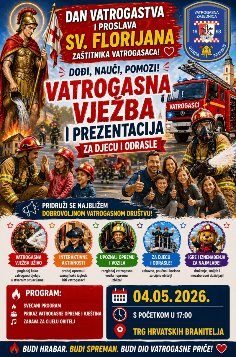 Draga djeco i roditelji, Vatrogasna zajednica Grada Petrinje poziva vas na Dan vatrogastva i proslavu Sv. Florijana, zaštitnika vatrogasaca, koja će se održati 4. svibnja 2026. godine s početkom u 17:00 sati na Trgu hrvatskih branitelja. Očekuje nas zanimljiv i sadržajan program namijenjen djeci i odraslima, uz puno edukacije, zabave i prilike da izbliza upoznamo hrabre ljude koji svakodnevno brinu o našoj sigurnosti. Ovo je izvrsna prilika da djeca kroz igru i druženje nauče više o važnom i odgovornom pozivu vatrogasaca, upoznaju njihovu opremu te razvijaju svijest o sigurnosti i pomaganju drugima. Pozivamo sve naše mališane i njihove obitelji da se pridruže i zajedno provedu ugodno poslijepodne ispunjeno veseljem, učenjem i zajedništvom.