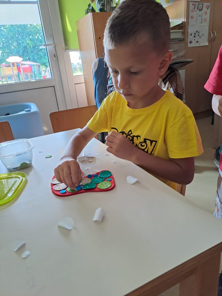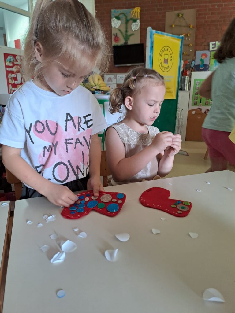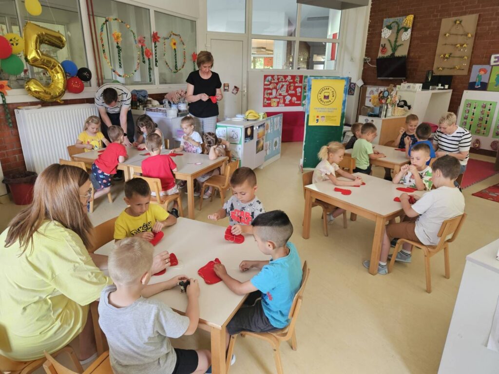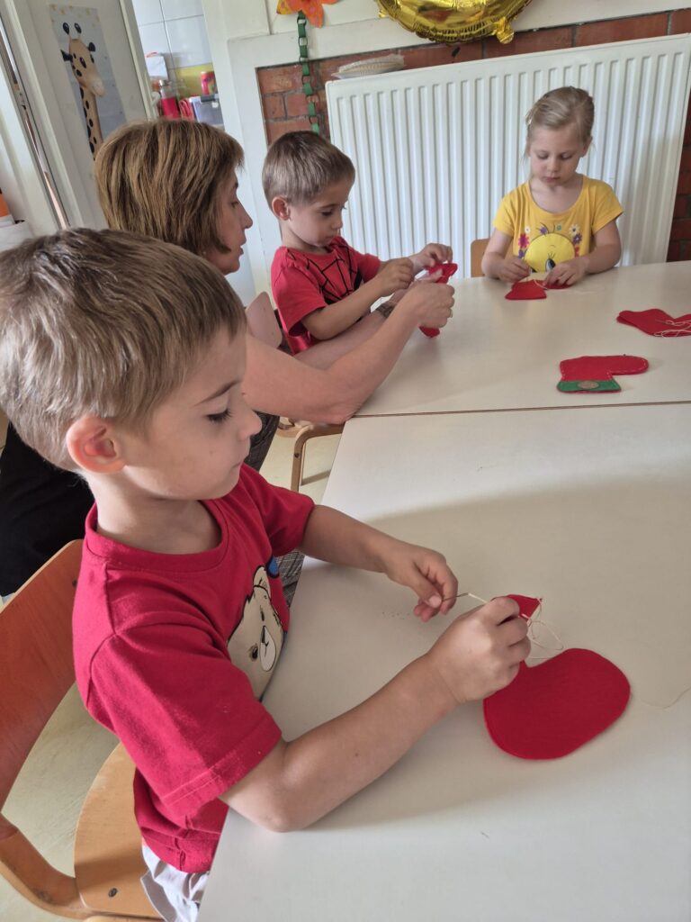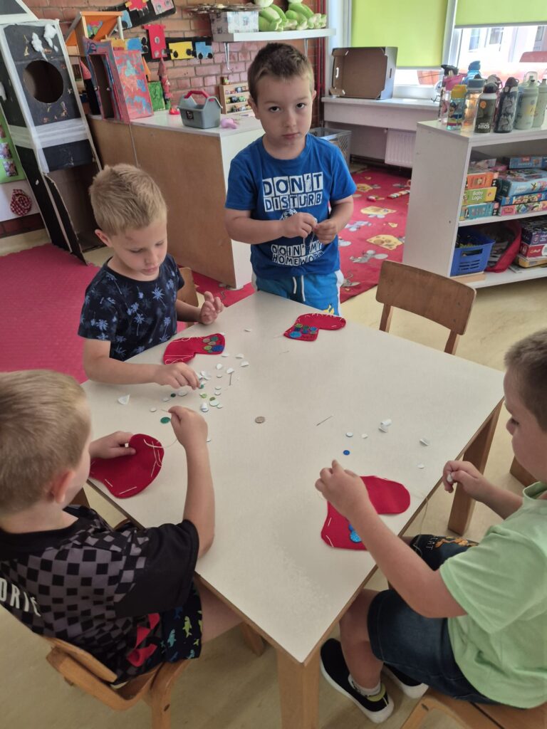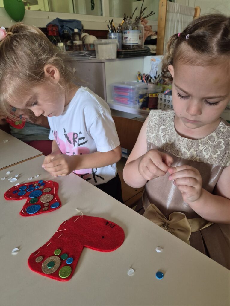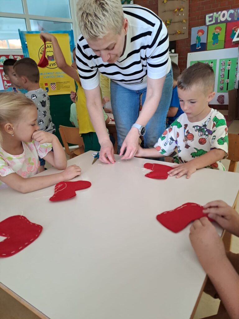 Radionica Hlapićeva čizmica, koja spaja likovnu i književnu umjetnost, provedena je u skupini Žabice s odgojiteljicama Ilkom Dumbović i Nelom Pezer. Ovom radionicom učili smo i vježbali puno toga, a bilo nam je jako zanimljivo što je to sve bio ručni rad. Uvlačili smo konac u iglu, krojili, šivali, vezli i ukrašavali čizmice od filca uz priču učiteljice iz 19. stoljeća. Nakon što smo sve to odradili, pred sobom smo imali puno lijepih čizmica i bili ponosni na svoj rad.